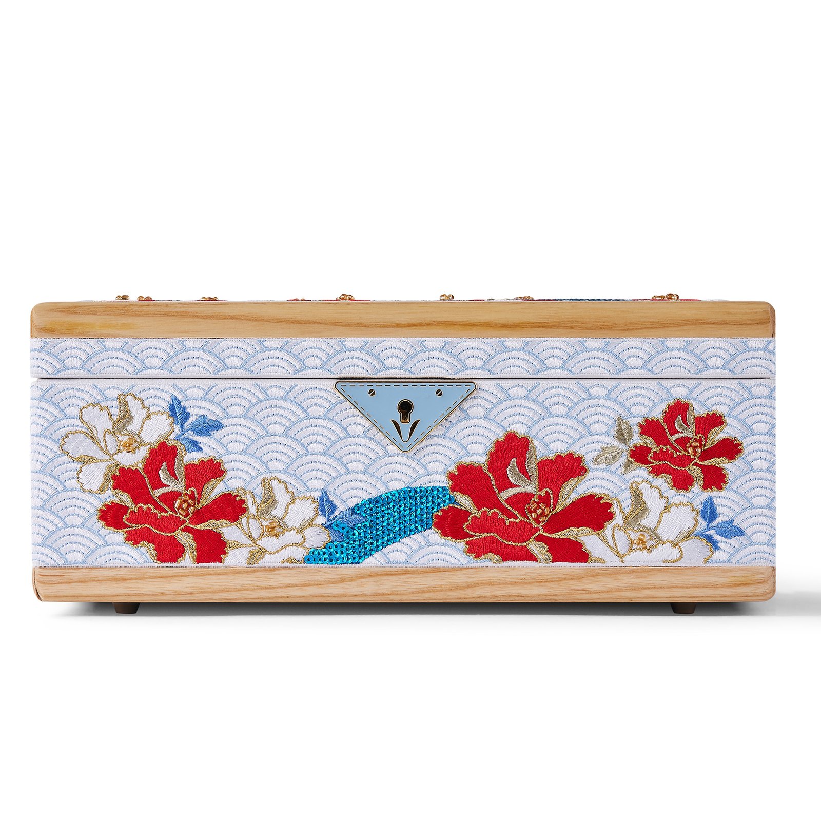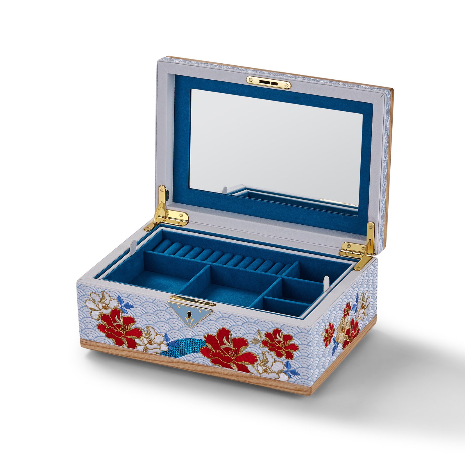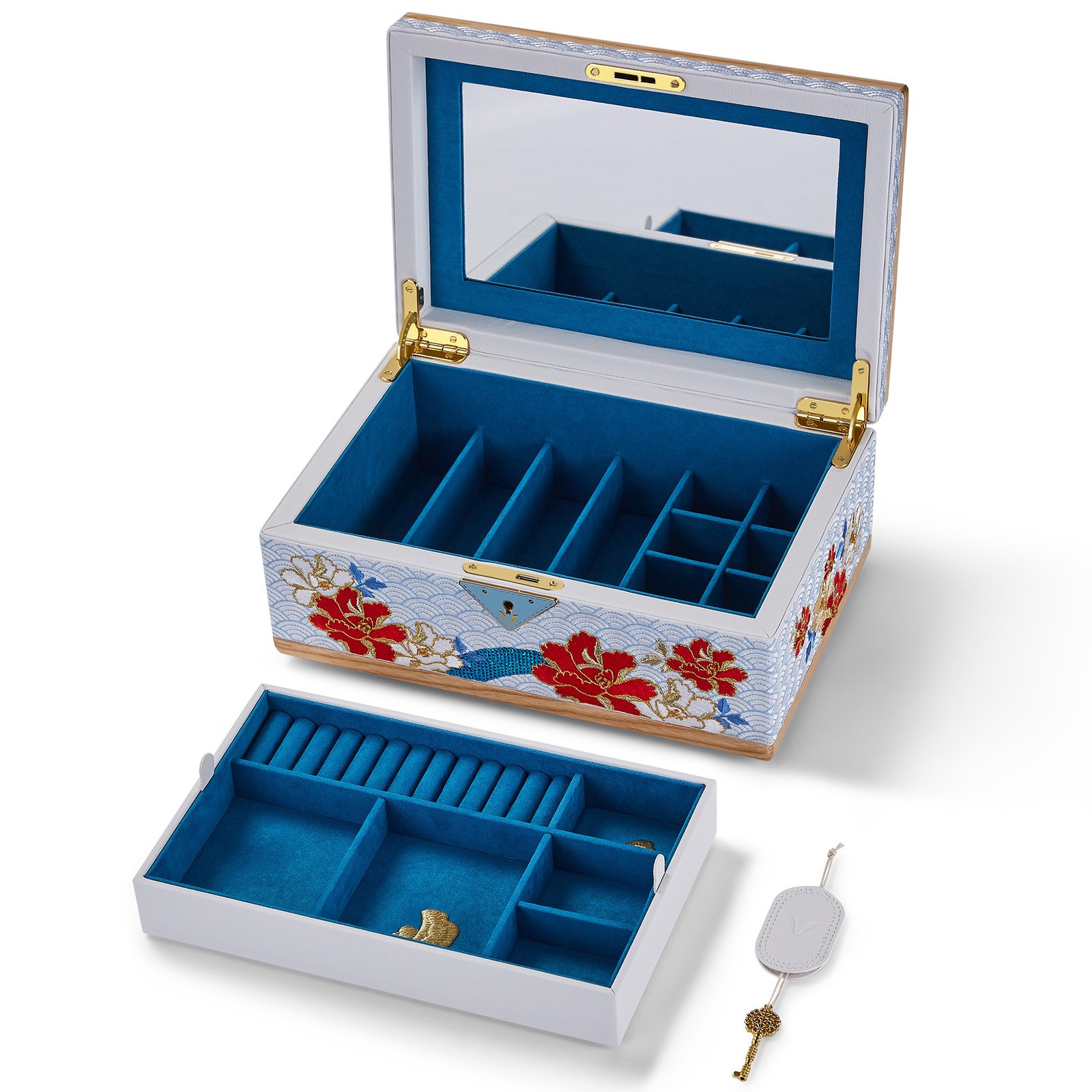Crafted with vibrant floral embroidery in rich red, blue, and gold tones, this jewelry box is more than just functional—it’s a decorative masterpiece that enhances any vanity or dresser.