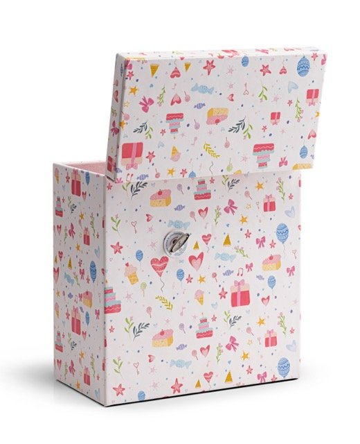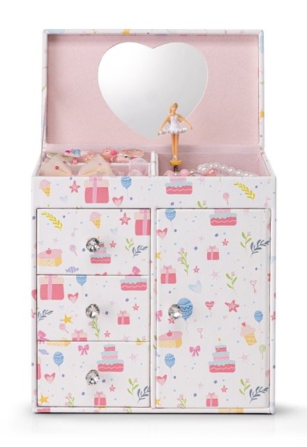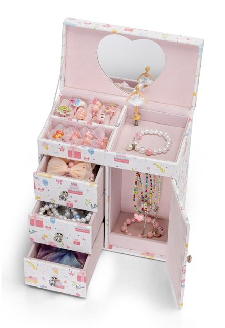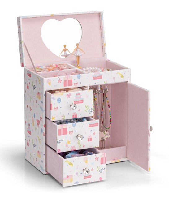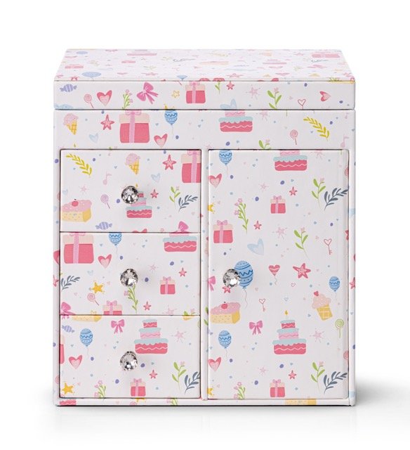 Adorned with pastel illustrations of cakes, presents, stars, and flowers, this jewelry box instantly brightens up any girl’s room. Its playful yet elegant design makes it both a functional organizer and a delightful decorative piece.